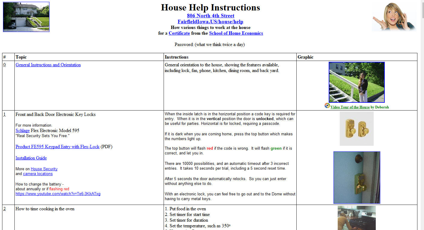 | 0 | General Instructions and Orientation | General orientation to the house, showing the features available, including lock, fan, phone, kitchen, dining room, and back yard. |