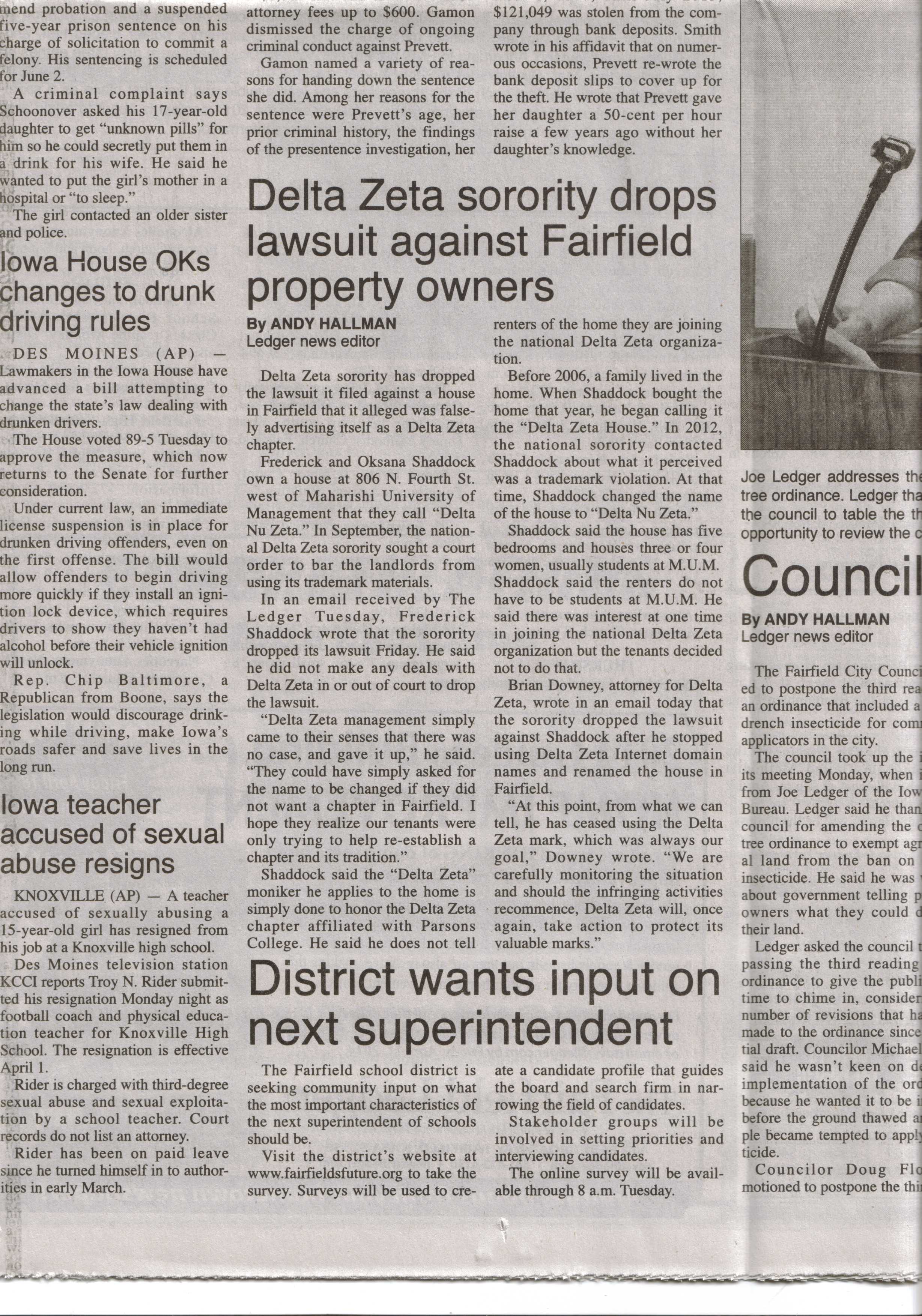 By ANDY HALLMAN Delta Zeta sorority has dropped the lawsuit it filed against a house in Fairfield that it alleged was falsely advertising itself as a Delta Zeta chapter. Frederick and Oksana Shaddock own a house at 806 N. Fourth St. west of Maharishi University of Management that they call "Delta Nu Zeta." In September, the national Delta Zeta sorority sought a court order to bar the landlords from using its trademark materials. In an email received by The Ledger Tuesday, Frederick Shaddock wrote that the sorority dropped the lawsuit Friday. He said he did not make any deals with Delta Zeta in or out of court to drop the lawsuit. "Delta Zeta management simply came to their senses that there was no case, and gave it up," he said. "They could have simply asked for the name to be changed if they did not want a chapter in Fairfield. I hope they realize our tenants were only trying to re-establish a chapter and its tradition." Shaddock said the "Delta Zeta" moniker he applies to the house is simply done to honor the Delta Zeta chapter affiliated with Parsons College (which went bankrupt in 1973 before Maharishi bought the campus). He said he does not tell |