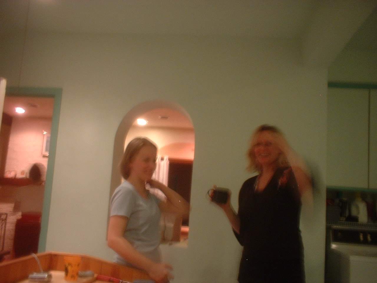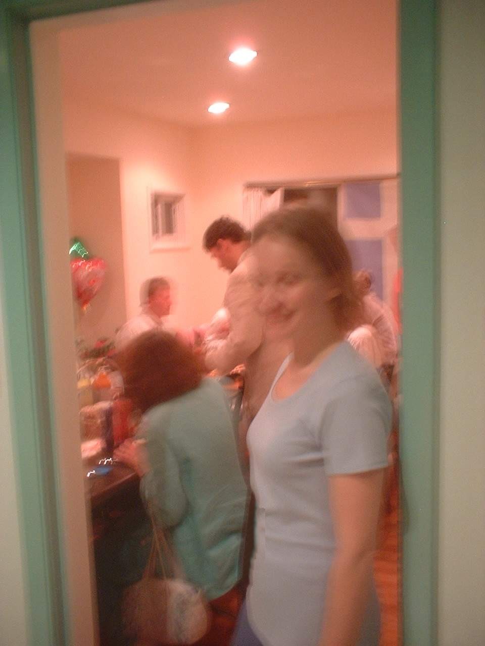 Guests arrive and convene in the kitchen